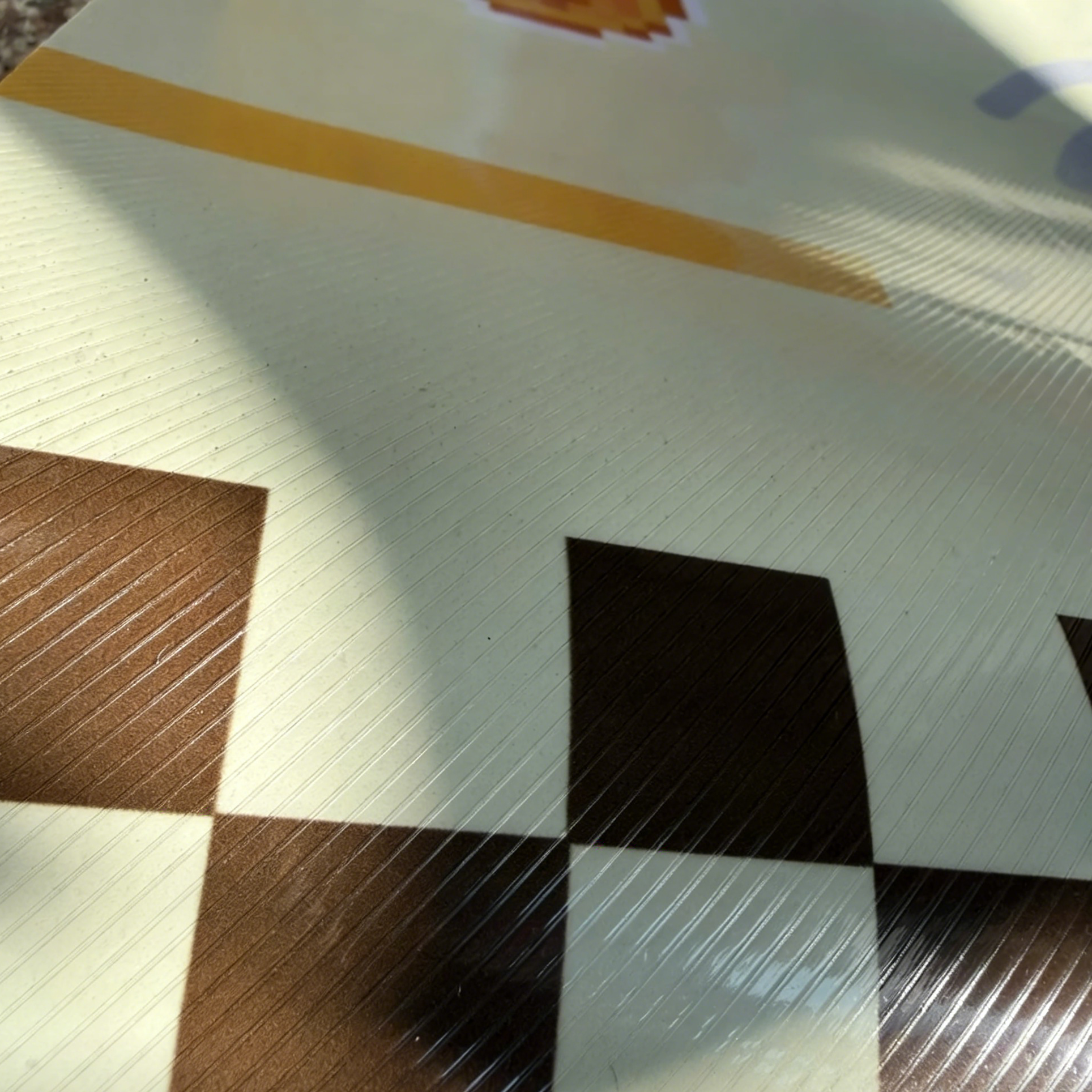 Custom floor graphics on anti‑slip vinyl with removable adhesive. Available in matte finish or diagonal line texture (stripe embossed). Designed for smooth surfaces: tile, marble, wood, metal, glass. Waterproof, scratch‑resistant, up to 1 year indoor durability. Starting at $1.03/sq ft. Request a free quote.